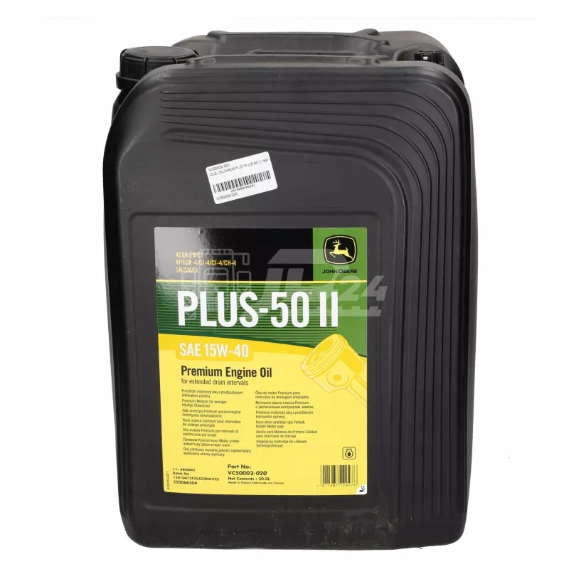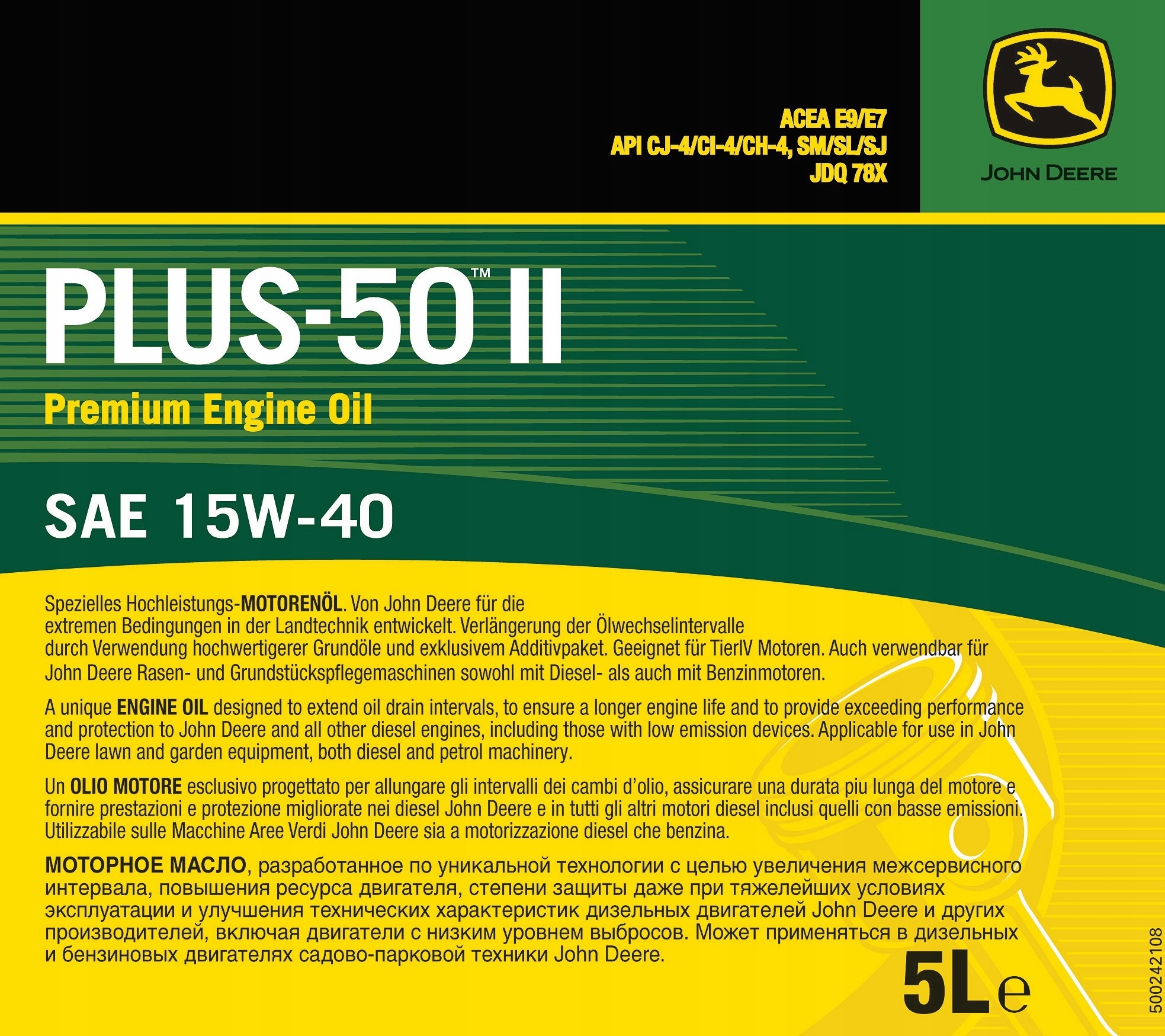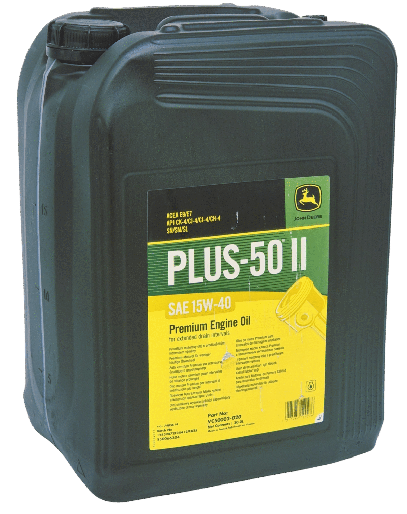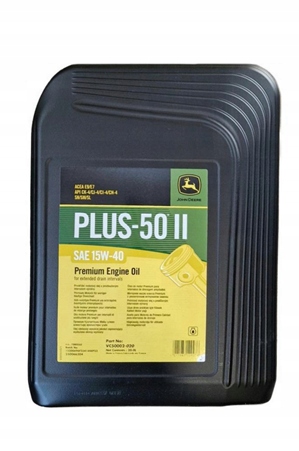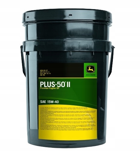 Olej Plus-50 II zapewnia najlepszą wydajność i ochronę przed zużyciem dla silników diesla John Deere. Doskonały do stosowania we wszystkich silnikach wysokoprężnych wymagających oleju 15W40 o specyfikacji CJ4. Olej ten jest zalecany do czterosuwowych wolnossących, doładowanych i turbodoładowanych silnikach Diesla z filtrami cząstek stałych (DPF), selektywną redukcją katalityczną (SCR), katalizatorem utleniającym (DOC) i układem recyrkulacji spalin z chłodzeniem (EGR). Nadaje się również do stosowania w silnikach benzynowych.