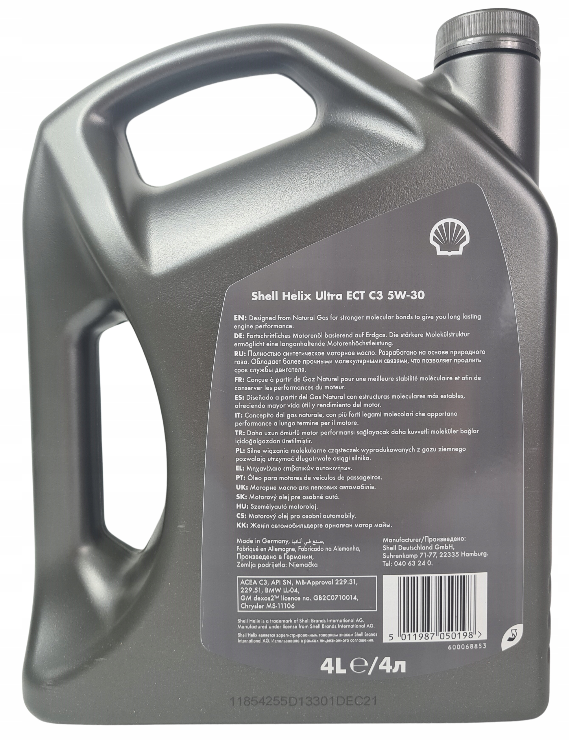 - Shell Helix Ultra ECT C3 to w pełni syntetyczny olej silnikowy opracowany z zastosowaniem najbardziej zaawansowanej technologii Shell zgodnej z systemami kontroli emisji spalin, chroniący katalizatory samochodów benzynowych i filtry cząstek stałych samochodów z silnikami Diesla. Chroni przed powstawaniem popiołów, które mogą powodować blokowanie układu wydechowego i zmniejszać wydajność silnika.