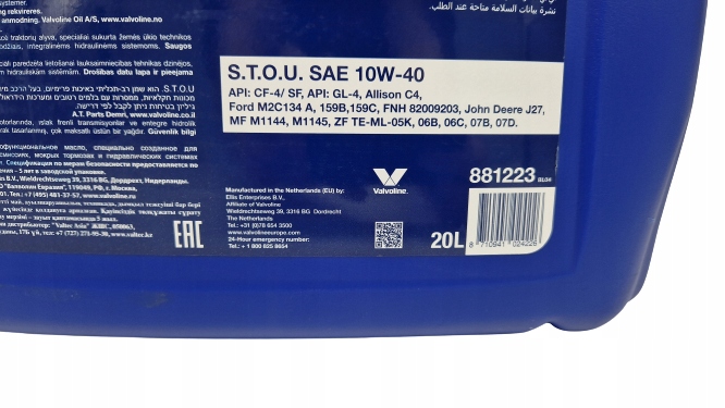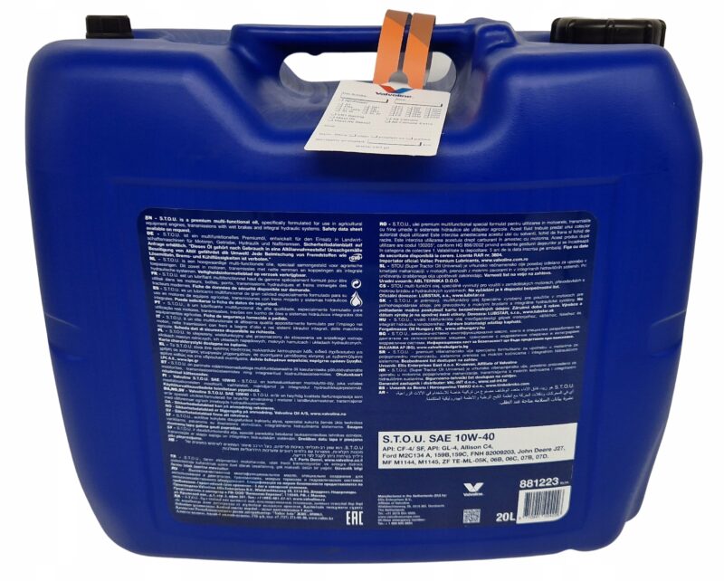 Valvoline STOU to najwyższej jakości uniwersalny olej spełniający wymagania dotyczące smarowania silników wysokoprężnych z turbodoładowaniem i bez, skrzyń biegów, przekładni, mechanizmów różnicowych i przekładni, układów hydraulicznych oraz ciągników z mokrymi układami hamulcowymi.
